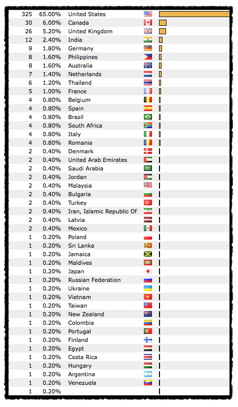 Ever wonder where all the visitors come from? I do. So I signed up for the free StatCounter service which not only tells me how many “hits” my blog gets, but also whether or not they are first time visitors, how much time they spent on my site, how many downloaded my various freebies, how many checked out my Creative Commons license, and what city, state and country they came from. It doesn’t tell me who the individuals are or their home address or other personal information but the info it does give me is just enough to help me to better focus my content on what my readers are interested in. Of course, your own comments and requests is always the surest way to nudge me in the right direction! As an example of the info I get from StatCounter, below is a screenshot I took of a chart showing the number of visitors by country in just the last 7 days.