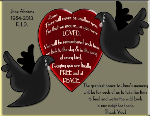 My heartfelt sympathies to Jane’s mom, (“Mrs. Abrams”), brother Rick and sister Pat who did and always will, love Jane dearly.
